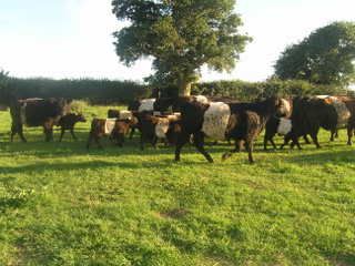 Our new pedigree Belted Galloway cows and calves have now arrived and are grazing a field up at Abinger Common. There are 21 in total; 11 cows a two year old heifer and nine calves. Having spent the winter housed in a barn they were very excited when they went out to grass. After a few weeks settling in we will introduce the cows to Harvey the bull.