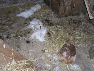 A scene of carnage met us in the hen house and yard yesterday, where we found eight decapitated hens and later three heads in scattered locations. The hen house was a mess of feathers and blood and nesting boxes were tipped over presumably when the fox was jumping up at the perched hens.