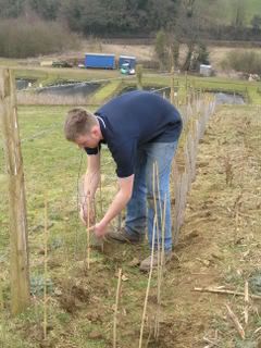 It’s important to get the whips (young tree about 60-80cm long) carefully into the hole, not damaging the roots and ensuring the root collar is level with the ground. A small cane is placed next to the whip and the soil is heeled back in. With the chance of more cold weather ahead it is crucial that we don’t leave gaps of air around the roots which could fill with water and freeze, possibly killing off the young tree.