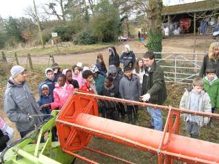 As well as learning about livestock farming, we introduced the children to the food we grow. We had buckets of seed; wheat, oats, oil seed rape and maize which the children could touch, whilst Laurence briefly explained the many different field operations involved in growing. Then up to the field to look at The combine harvester.