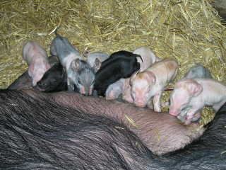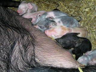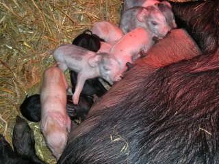 As Phoebe laid down to give birth to the last two piglets, she almost squashed two that were beneath her. So far, she seems a lot less vocal than Prudence in warning her youngsters that she is on the move.