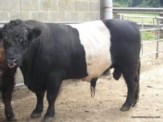 Our main beef herd arrive on the farm at about ten days old and stay for about two years; these are a mixture of females and castrated males which are not producing calves. The only breeding stock we have are the Belted Galloways, which are black at the front and rear end of the animal with a white band around its middle.