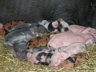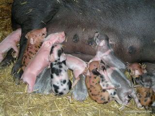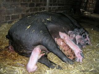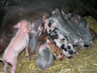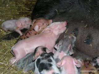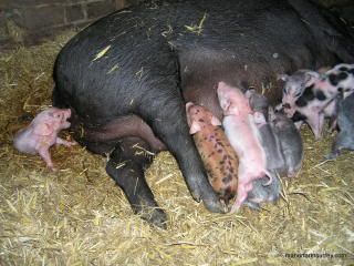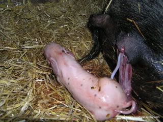 It's a bit of a bun fight as the piglets learn how to feed, with a lot of treading on each other and fighting over teats. Some piglets still have umbilical cords trailing but these tend to detach and the sow (her description now that she's on her 2nd litter) will clean these up from the straw along with her afterbirth.