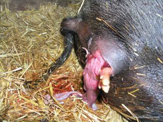 This is the last piglet to be born, it's coming out rear end first. See the tiny tail to the left and a foot emerging to the right.