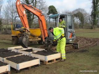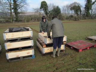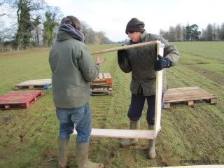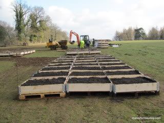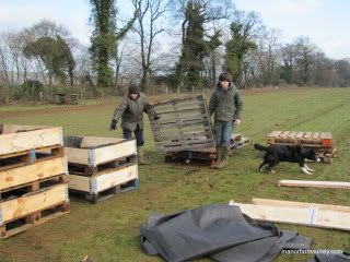 Work began last week; however the snow, frost and a deluge of rain have hindered progress. Pallets are placed in rows in the field with a tractor width between them. As it was half term, Edward helped prepare the pallets with Gillian Van Der Meer who is designing the display for the RHS.