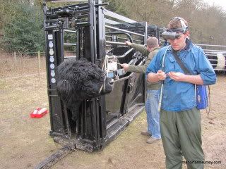 This winter we've seen some stylish head gear on the farm, but nothing as useful as the scanning equipment that Tom, the vet had to wear today. This photo shows Harvey waiting patiently as Tom prepares a nose ring for him.