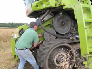 Laurence began harvesting the winter rape last week but things haven’t gone smoothly, with four major break-downs already. The combine harvester wasn’t performing well the first day and Laurence discovered that the sieves hadn’t been cleaned out properly prior to harvest and that caused a four hour stoppage.