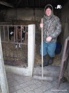 Ed defrosting a tractor and Sam littering up the calves