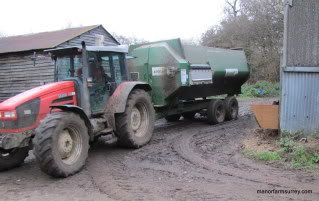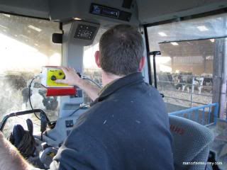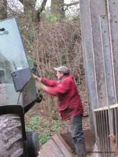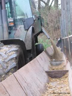 Donald reverses the tractor and feed wagon alongside the barn,