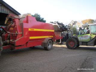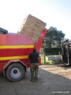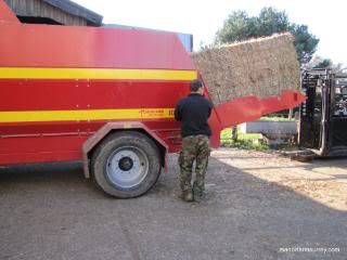 The tele-handler then loads two bales into the rear of the chopper which is powered by a tractor. Ed controls the chopper from within the tractor cab and chopped straw shoots out into the barn.