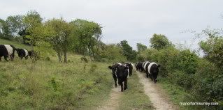 The Belted Galloways have been grazing the North Downs over the summer and earlier this month we walked the young stock from Blatchford Down, past New Barn and back to Hackhurst. Years ago I worked for the National Trust along the Downs and subsequently for Barbara Blatchford, so I’ve always known this area as Blatchford Down; although current NT staff call this area the Plantation.