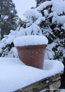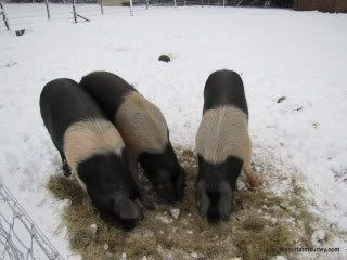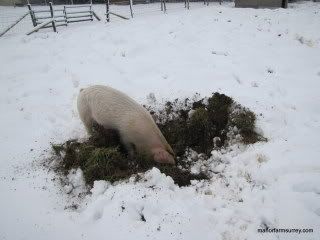 Here's Spot Jnr checking for soil beneath the strange white stuff, while the Saddleback gilts are more interested in food.