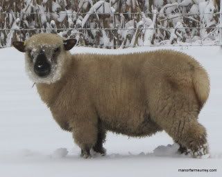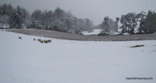 The Hampshire Down sheep look like teddy bears with snowy beards and the grass they moved onto three weeks ago has disappeared overnight.