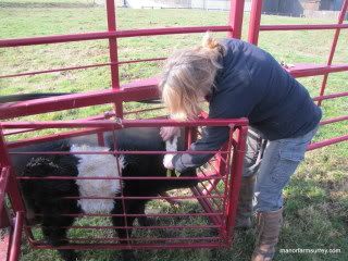 Cattle must have two ear tags so we use a cattle 'grab' to catch the calf and this provides a safe area in which we can work with the mother outside the cage.