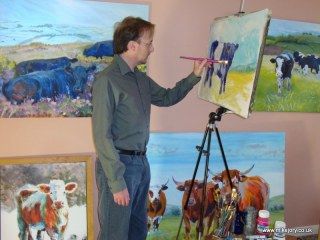 In this photo Mike is painting a Belted Galloway and the two paintings to his left are amongst those that led me to contacting Mike.