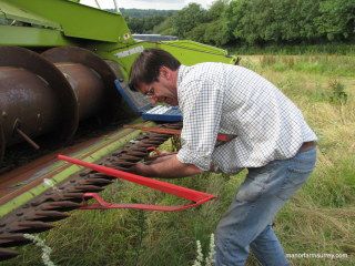 The cutter bar was hitched onto the front of the combine harvester and Laurence attached the lifters which lift the crop off the ground and onto the knives.