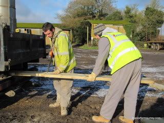 Here are the contractors in freezing weather last week cutting the shuttering boards to lay the base for the electric station by West Lane