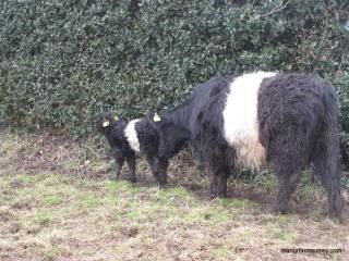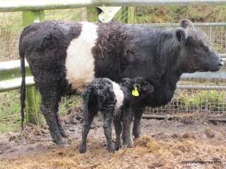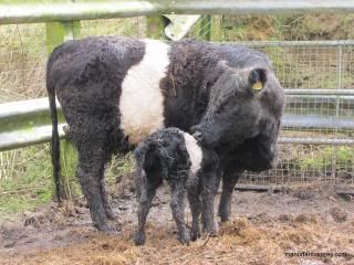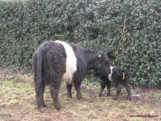 Since early March we’ve increased the numbers of visits to check seven in-calf Belted Galloway heifers, but it seems that Darcey with a due date around 7th March, didn’t want to go first!