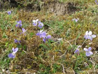 Hairy Violets on chalk downland range from white to purple in colour, here they are growing amongst salad burnet and moss.