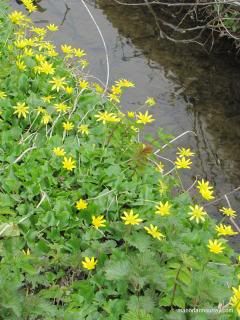 Celandine amongst the leaves of Meadowsweet on the banks of a stream. Meadowsweet favours wet habitats such as damp meadows and riverbanks; it will grow between 3-7 feet and flower June to early September, with clusters of fluffy creamy-white flowers.
