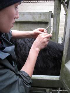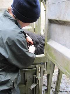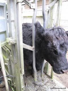 TB testing was undertaken this week on all Belted Galloway cows and heifers on the farm that have previously calved, plus the bull. We needed to be well organised to get round all seven locations and have a cattle crush moved and ready in position.