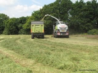 A series of tines lift the mown grass into the forage harvester which chops the grass into fine pieces and blows it into a trailer which travels alongside the harvester.