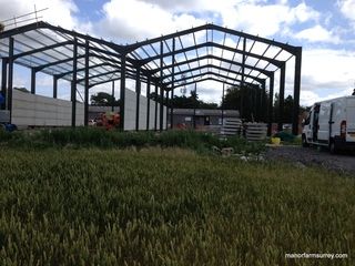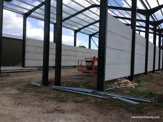 The grain store frame is now up and some of the concrete panels are slotted into place.