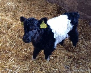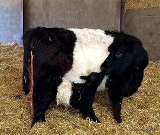 It was interesting to find her first calf had a perfect belt and yet this year her bull calf named 'Louis' has two long white socks at the front and two shorter socks on his hind legs which are hidden in straw.