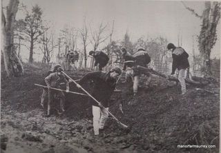 In 1986 the pond at Coomb farm was dreged by the conservation team who had their base at Coomb Farmhouse; here the team finish off the banks ( black and white photo).