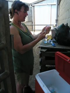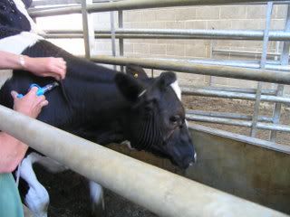 These photos show Amanda connecting the vaccine bottle to the Stericap (we just call it a vaccine gun) and then giving an injection to one of the cattle. The needle passes through the stericap and is automatically disinfected on its way into the animal and again as the needle is withdrawn and then it's ready for the next injection. It's a quick and easy system which makes the job efficient.